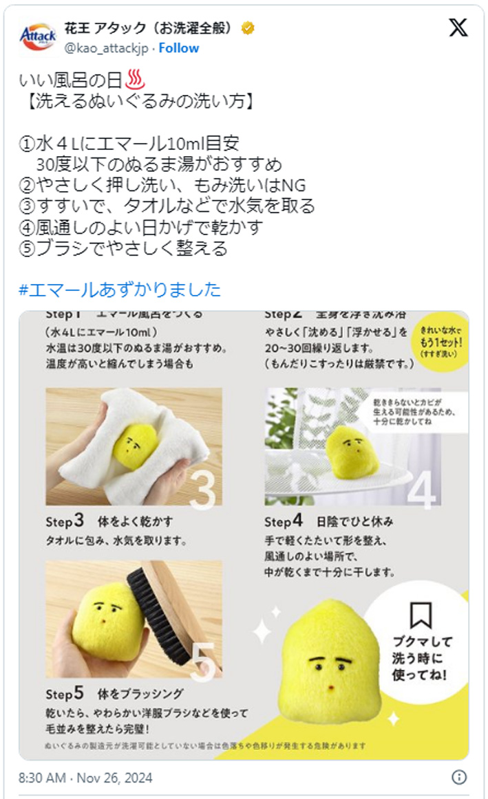日本花王分享“玩偶清洗5步骤”,教各位娃爸娃妈帮自己的宝宝洗澡,吸引2.8万网友按赞、2.7万收藏,引起热烈讨论。