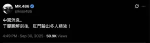 于朦胧死因至今在各网讨论,没想到486先生突然在X(前推特)上写下:「中国消息。于朦胧解剖后,肛门验出多人精液!」瞬间引发了韩网友热议,除了在该文下方留言讨论,网友也纷纷截图将其转发。
