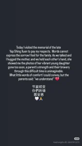 东姑扎塔莎17日在小红书账号更新帖文,分享自己前往灵堂以示悼念叶芯嫙。