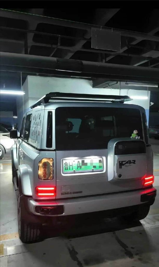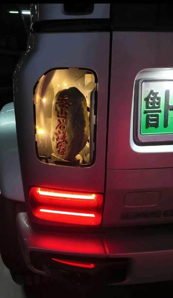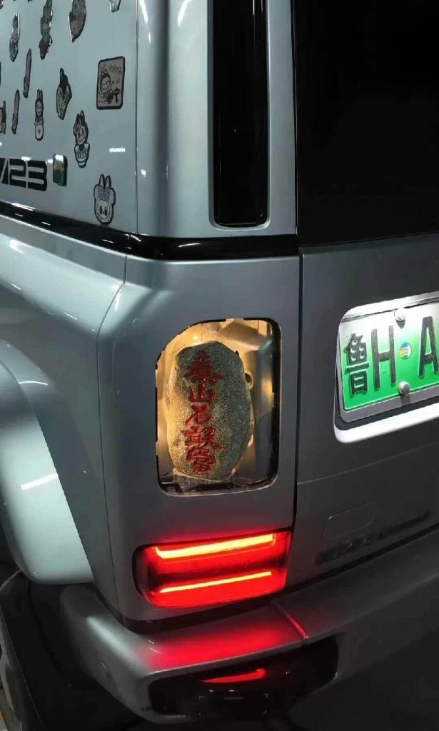从画面中可见,这块石头被巧妙地安置在车辆的尾灯之间,上面刻着一些字迹,虽然在行驶中可能难以辨认,但这种装饰无疑为车辆增添了一份独特的个性。