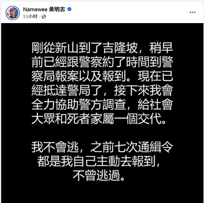 黄明志卷入网红谢侑芯猝死案,警方更对黄明志发布通缉。但就在5号凌晨,神隐多日的他突然现身,在社群平台,发布自拍影片并发文写下:“刚从新山到了吉隆坡,并抵达警局报到,将全力配合调查,给大众及死者家属交代”,还强调自己不会逃,因前几次通缉令,都是自己主动报到。