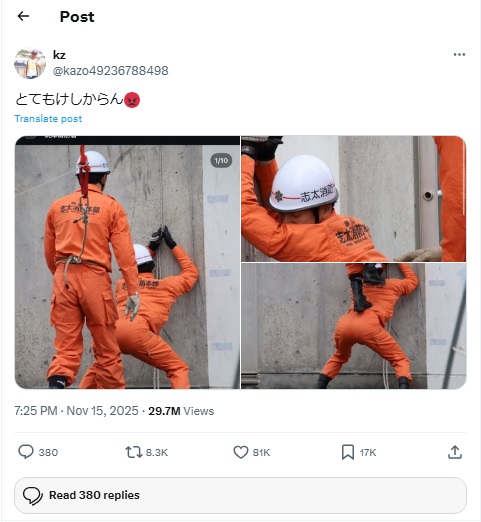 照片曝光后,立即IG掀起一波讨论热潮,当时有不少网友看到2人的姿势,兴奋直呼“很害羞”,也表示希望未来能看到更多类似的照片。后来这些照片被网友“kz”分享到社群平台X,涌入超过1900多万人次浏览,并让志太消防本部在全球一夕爆红,IG账号更是不断用入大批粉丝关注,志太消防本部为此紧急隐藏原本的贴文。