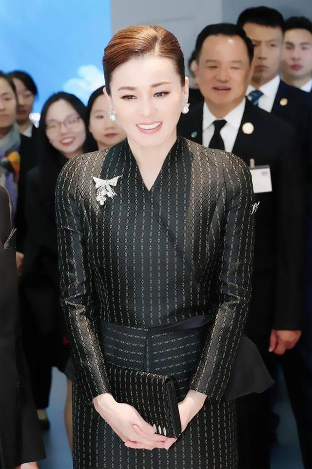 她的穿搭,也成了 “外交语言”—— 深灰色的沉稳,象征对两国关系的珍视;中式立领与泰式剪裁的融合,暗喻中泰文化的交融。