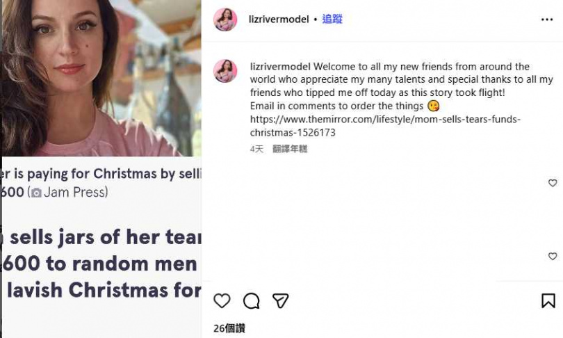 美国44岁单亲妈妈靠贩售装瓶眼泪,每瓶售价高达600美元,资助全家过节。(图/翻摄自IG,lizrivermodel)