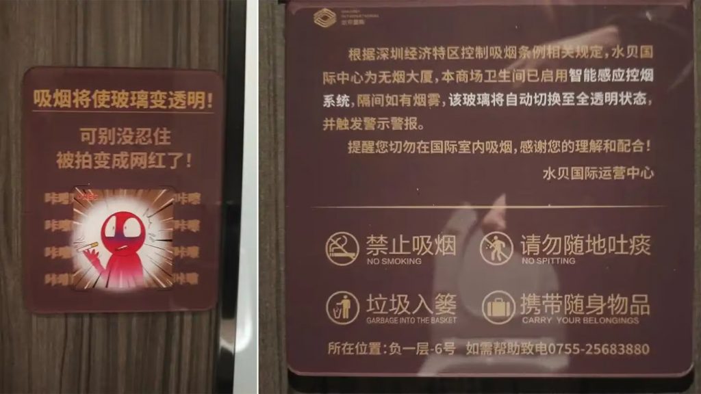 据中国媒体深视新闻报道,上述智能装置位于深圳罗湖区水贝国际中心。记者昨天(15日)到现场后发现,位于商场地下一层的男厕所内,部分厕所隔间安装了这款特殊玻璃,并张贴提示牌幽默提醒用户:“吸烟将使玻璃变透明!可别没忍住被拍变成网红了”。提示还配有一个卡通化的“尴尬”表情包。