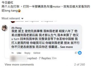根据“Ah Heng”的留言,自称是屋主的他指出,“是他先挑事情,我和我老婆相爱八年了,他差点撞到我老婆后面,我才那么生气。”