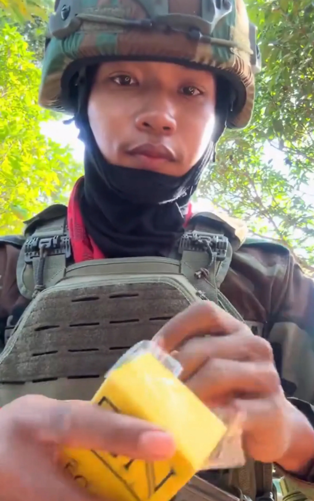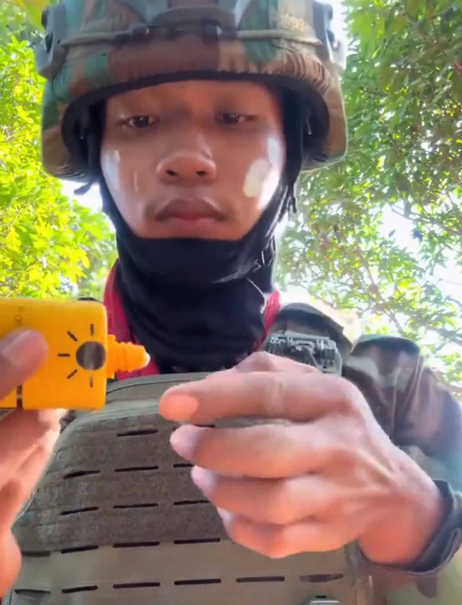 近日在网路上疯传一段“柬埔寨战场直播带货”影片,画面可见一名长相清秀的士兵头戴钢盔、身穿全套迷彩服,背上防弹背心,胸前还挂有几个弹匣。