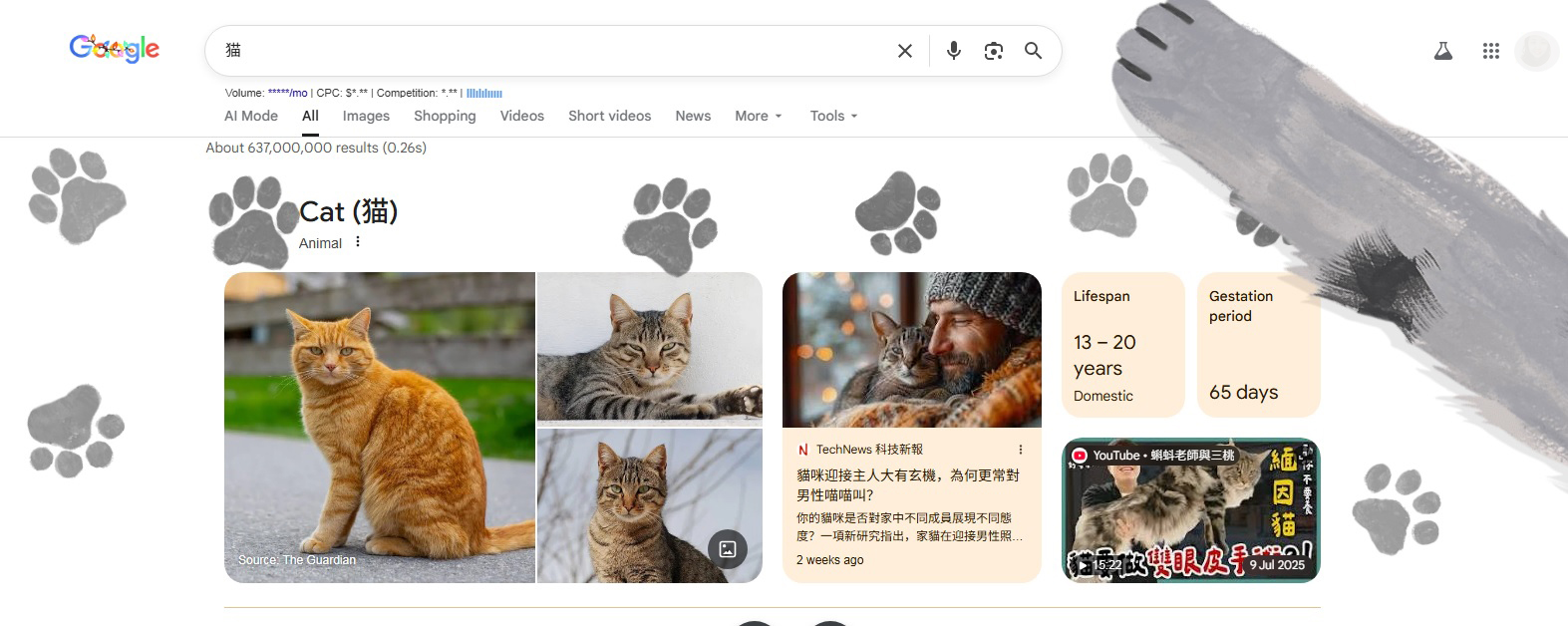 此外,搜寻“Dog”或“狗”,点击狗脚印图示后再点击荧幕各处,会冒出狗掌印互动特效;猫派人士改搜“Cat”也有相同玩法。至于经典指令“Do a barrel roll”,则会让整个网页360度翻转,而输入“Askew”时,搜寻页面甚至会直接倾斜,让人一秒头晕。