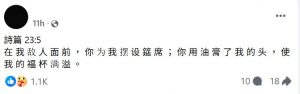 据观察,涉案当事人于昨晚在其个人脸书账号上更新动态,引用了《诗篇 23:5》的内容:“在我敌人面前,你为我摆设筵席;你用油膏了我的头,使我的福杯满溢。”